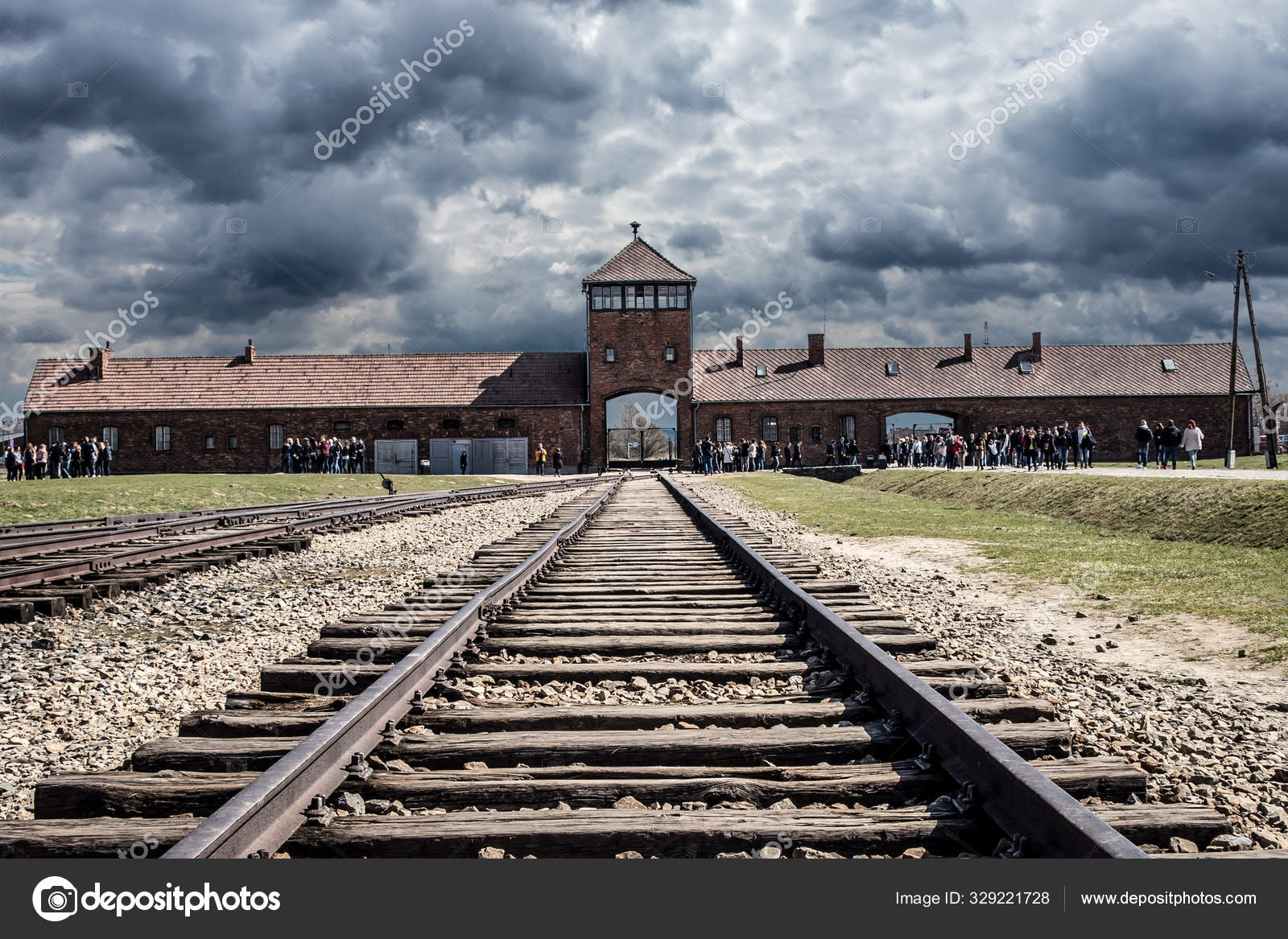 Oswiecim, Poland – April 7, 2018: Auschwitz Birkenau Gate Rail Entrance German Nazi Concentration and Extermination Camp in World War Two, Poland